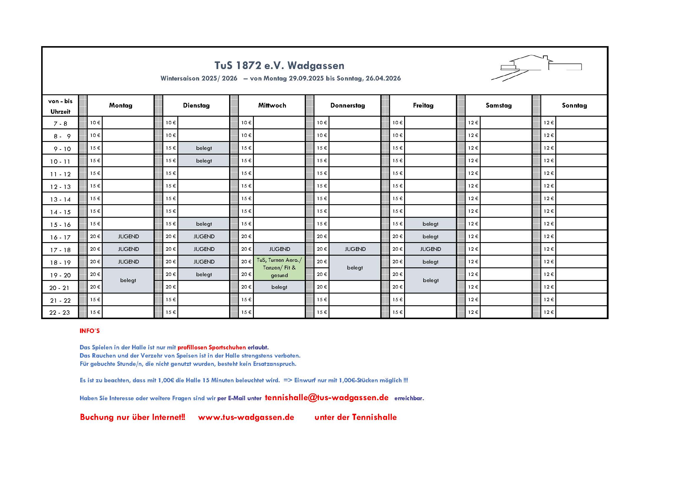 Hier finden Sie den Belegungsplan der Tennishalle mit Kosten und Nutzungsbedingungen zum Download als PDF-Datei.